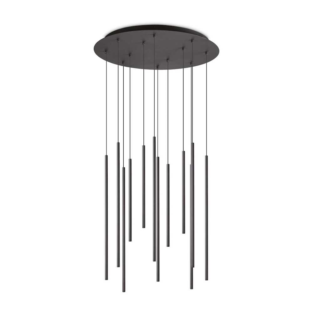 Dizajnový závesný luster FILO SP12 má kovovú rozetu a tienidlá/tyče s práškovým nástrekom alebo pokovovaním. Čierne elektrické vodiče z PVC. Farby: biela, čierna alebo mosadz.