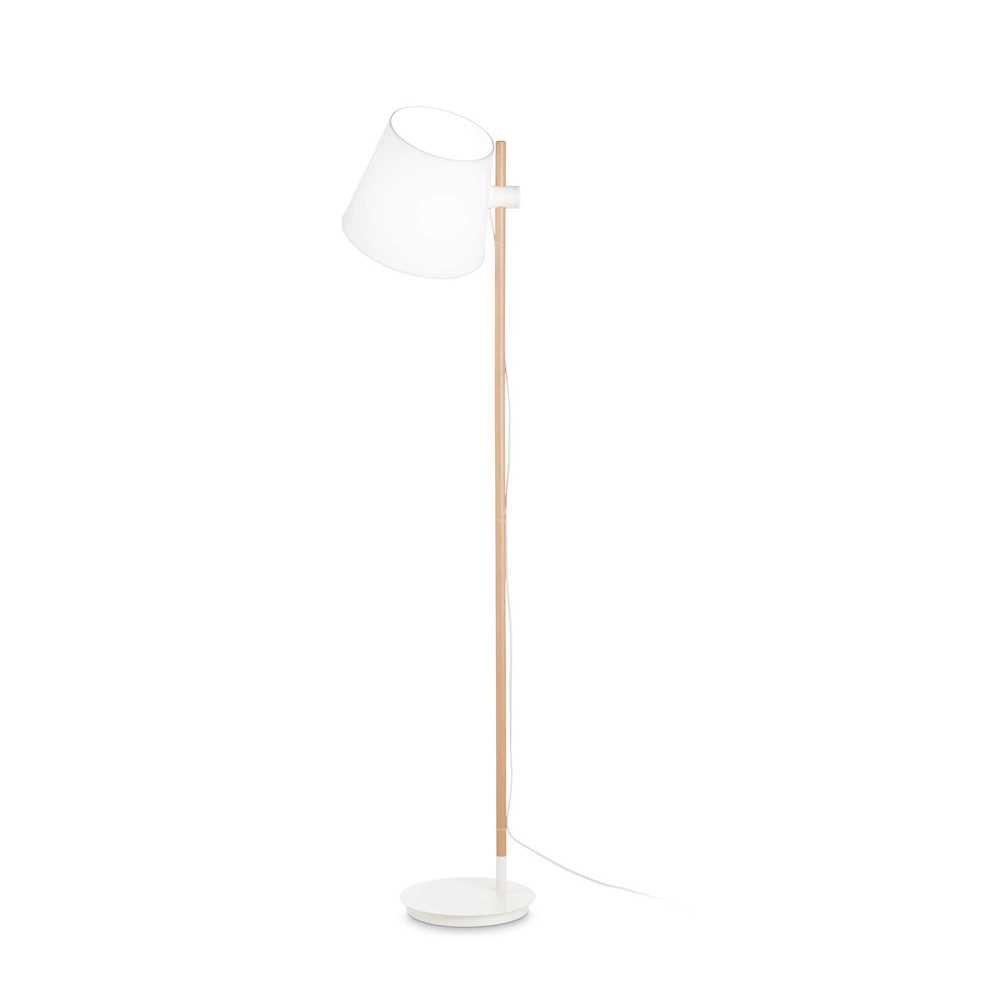 Drevená podlahová lampa AXEL PT1. Kovová základňa a spoje s práškovým nástrekom. Tyč z prírodného dreva. PVC tienidlo potiahnuté látkou možno výškovo nastaviť. PVC kábel s vypínačom. Dostupné farby: biela alebo čierna.