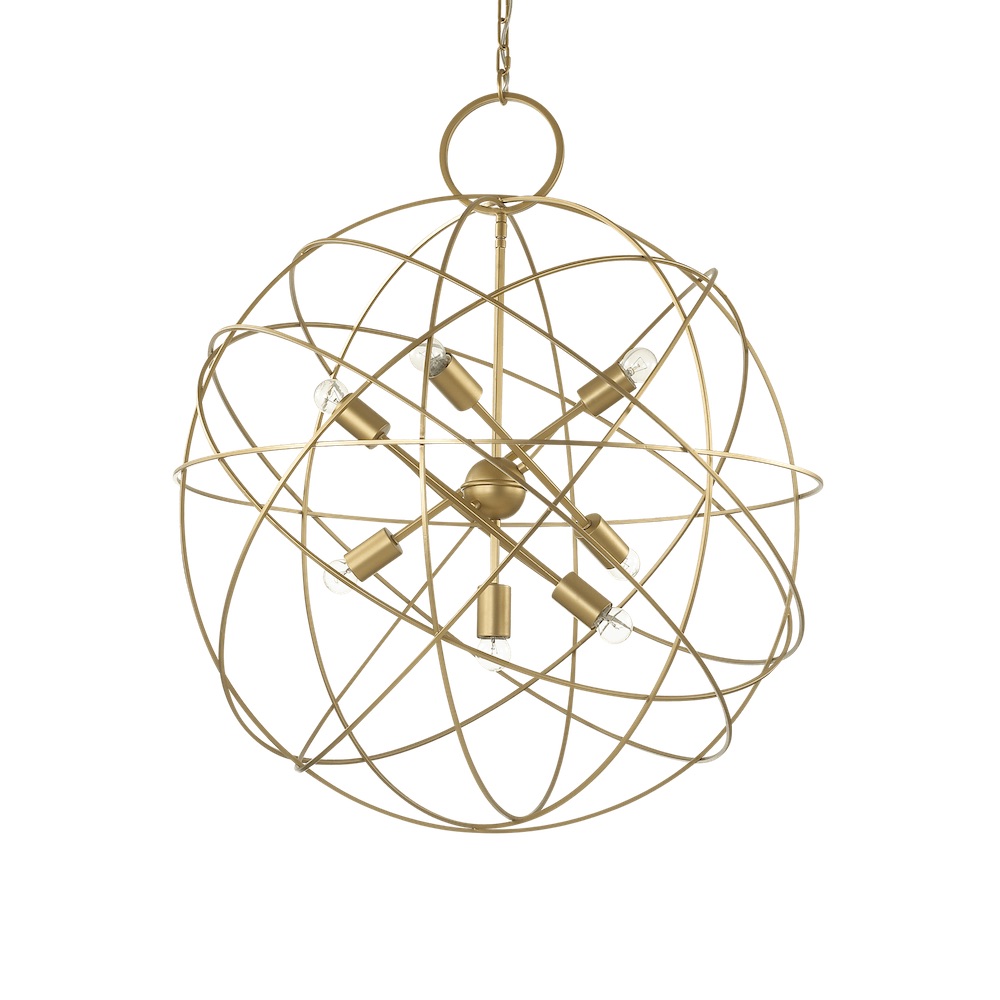 Kovový závesný luster v zlatej farbe KONSE SP7. Kovová konštrukcia a ozdobné prvky. Saténový lak z tmavého zlata. Závesná reťaz.