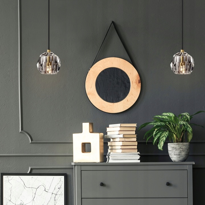 Lampa sklenená závesná v tvare krištáľovej gule. Svietidlo je vyrobené z kryštálov a kovu – v tienidle prevláda sklo a maskara aj objímka nad tienidlom sú celé z kovu v čiernej farbe.