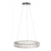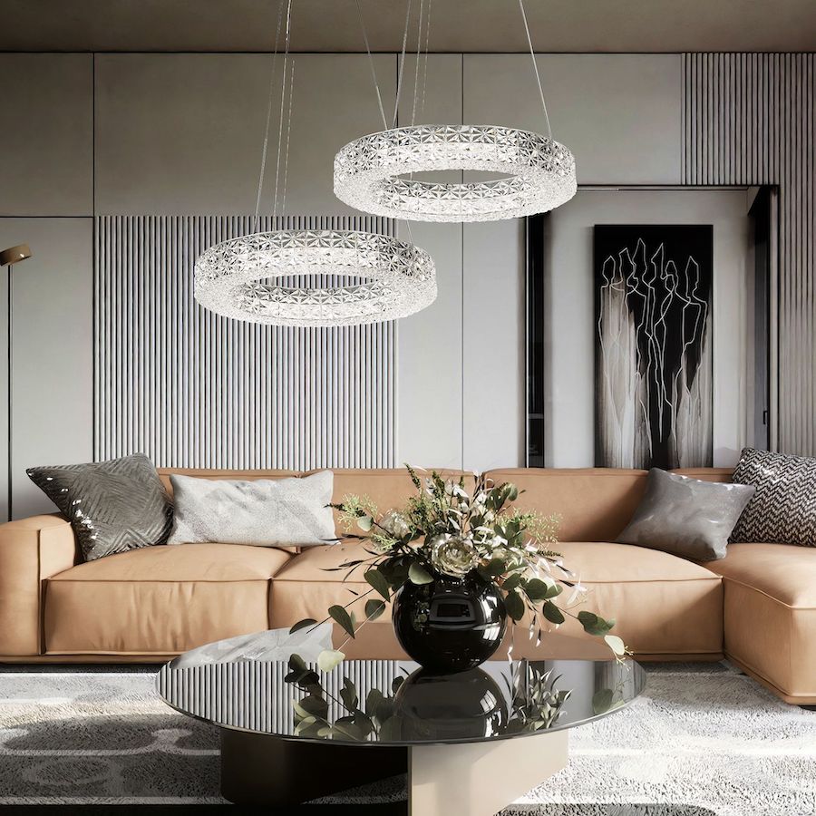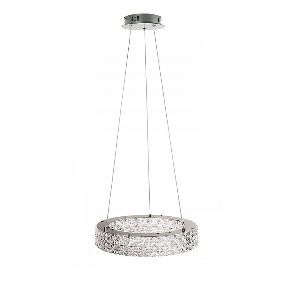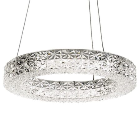 LED luster do obývačky Ø 40cm je jemným spojením minimalistického dizajnu a sofistikovaného lesku. Okrúhle plastové tienidlo, štylizované do brúseného kryštálu, má výšku 5 cm a je zavesené na takmer neviditeľných vlascoch, vďaka čomu svietidlo pôsobí dojmom vznášajúcej sa vo vzduchu. Jemné chrómované akcenty dodávajú lampe teplo a glamour tóny, pričom nezahlcujú jej štíhlu podobu. Integrovaný LED zdroj generuje rovnomerný prúd 1001 – 1500 lm s neutrálnou farbou 4000 K, čo zaručuje pohodlné osvetlenie s nízkou spotrebou energie. Kryštálová štruktúra tienidla jemne rozptyľuje svetlo, vytvára elegantné odlesky a zdôrazňuje luxusný charakter interiéru. Regulácia výšky umožňuje presne prispôsobiť luster výške miestnosti a zamýšľanej kompozícii – nad stolom v jedálni, v obývačke alebo spálni. Táto lampa predstavuje sofistikovaný akcent, ktorý spája funkčnosť s nadčasovým šarmom kryštálov.