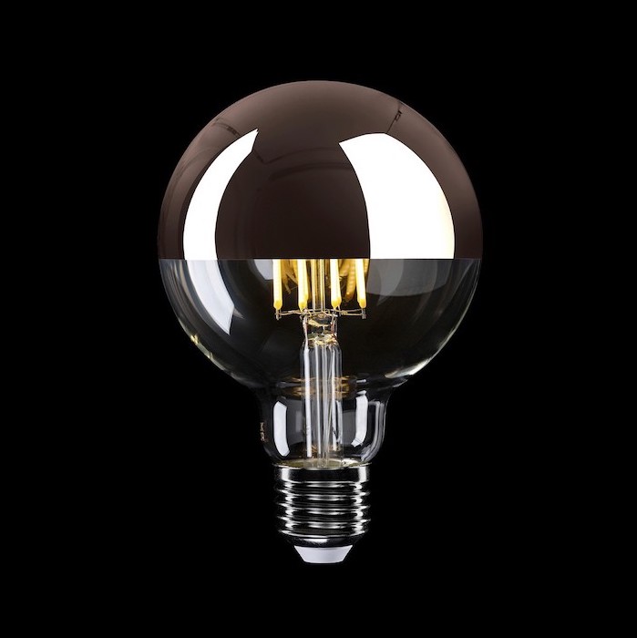 Zrkadlová kolekcia FILAMENT obsahuje LED filament, ktorý sa používa v nových LED žiarovkách a je približne 4cm dlhý sklenený alebo zafírový pásik, na ktorom je umiestnených zhruba 25 LED diód zapojených do série. LED čipy sú vyrábané technológiou COG – Chip On Glass. Tento pásik je celý obalený vrstvou luminoforu. Na rozdiel od klasických LED čipov je napájaný malým prúdom. Malý prúd napájajúci filamentové žiarovky umožňuje úspornú konštrukciu napäťového meniča, ktorý nevyžaduje chladenie a celý sa zmestí do pätice E27. Dekoračné žiarovky obsahujú polovičné zrkadlo, vďaka ktorému žiarovka odráža svetlo spätne na stenu a vytvára prekrásny dekoračný efekt. Špeciálne zrkadlo ponúka dokonalé osvetlenie, prekrásne farby a lepšie chladenie žiarovky. Tieto elegantné moderné žiarovky budú ozdobou vašej miestnosti a domácnosti.