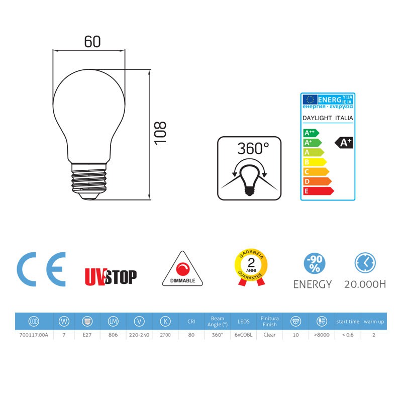 • LED Priehľadná žiarovka - A60, DAYLIGHT ITALIA