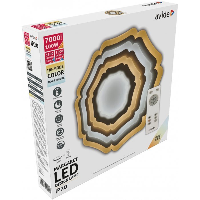 Vďaka svojmu jedinečnému tvaru vytvárajú nové dizajnové stropné svietidlá Avide Design vo vašej domácnosti jedinečný štýl. Pre každý model sú k dispozícii 3 režimy osvetlenia. V prvom a druhom režime možno na dosiahnutie rôznych svetelných efektov použiť kombináciu teplých bielych a studených bielych LED diód, zatiaľ čo tretí režim využíva kombináciu teplých bielych a studených bielych LED diód na vytvorenie prirodzenej teploty bielej farby, čím sa zdvojnásobí výkon.