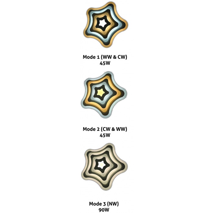 Vďaka svojmu jedinečnému tvaru vytvárajú nové dizajnové stropné svietidlá Avide Design vo vašej domácnosti jedinečný štýl. Pre každý model sú k dispozícii 3 režimy osvetlenia. V prvom a druhom režime možno na dosiahnutie rôznych svetelných efektov použiť kombináciu teplých bielych a studených bielych LED diód, zatiaľ čo tretí režim využíva kombináciu teplých bielych a studených bielych LED diód na vytvorenie prirodzenej teploty bielej farby, čím sa zdvojnásobí výkon.
