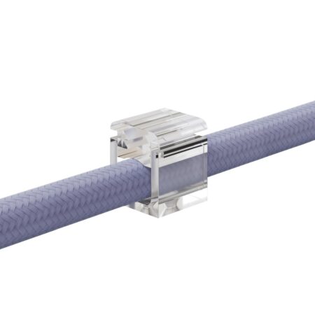Mini nástenný úchyt na textilný kábel, transparentný je ideálne príslušenstvo na upevnenie elektrických káblov s textilným poťahom na stenu bez narušenia estetiky inštalácie. Vďaka minimalistickému dizajnu a extrémne kompaktným rozmerom je takmer nepostrehnuteľný pre oko. Je vyrobený z priehľadného polykarbonátu a splýva s povrchom, čo umožňuje káblu definovať priestor a zvýrazniť jeho farby a textúry. Výšku zatvárania spony je možné nastaviť podľa priemeru kábla, na ktorý je nainštalovaná, vďaka čomu je kompatibilná s 2×0,75mm a 3×0,75mm káblami.
