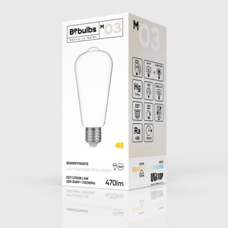 Žiarovka, ktorá spája tvar Edison ST64, inšpirovaný tradičnými žiarovkami a modernou technológiou LED vlákien: predstavujeme žiarovku Milky v bielom opalizujúcom skle. Pre rovnomerné osvetlenie bez odleskov. LED žiarovka ST64 M03 Milky Edison bola navrhnutá tak, aby zaručovala dobré podanie farieb a rovnomerné rozloženie svetla. Vďaka spotrebe 4W a svietivosti 470Lm budete môcť udávať tón svojmu okoliu, obytnému aj komerčnému. Vďaka objímke E27 je tiež kompatibilný s väčšinou štandardných objímok žiaroviek na trhu.