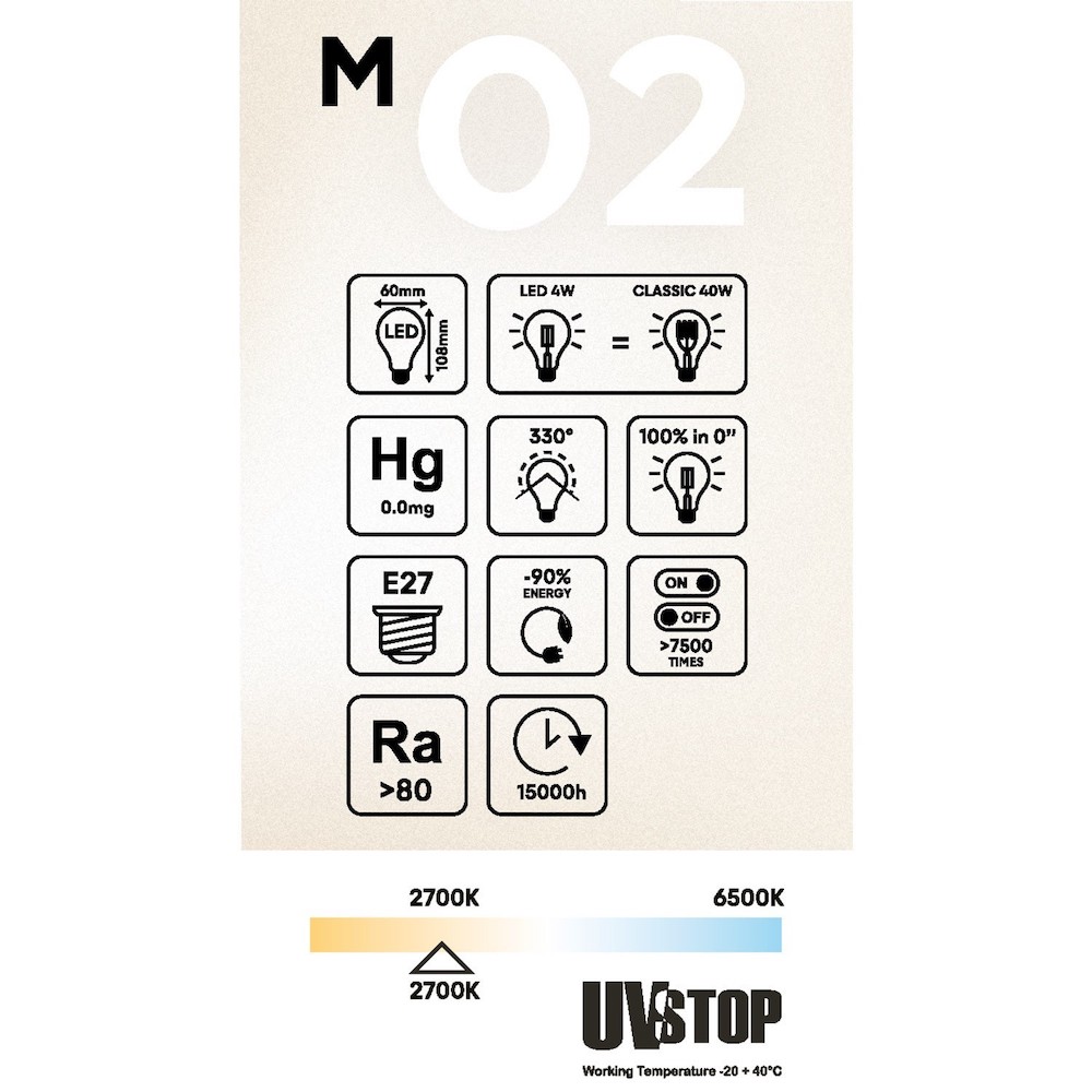 Farba svetla vyžarujúca žiarovku sa rovná 2700K. Teplé osvetlenie prispieva k vytvoreniu upokojujúceho a príjemného prostredia, podobne ako osvetlenie v tradičných žiarovkách. Chodby, kancelárske priestory, spálňa… bez ohľadu na priestor, táto žiarovka určite dokonale doplní svoje okolie. Žiarovky s opalescentným sklom zaisťujú hladké a rovnomerné osvetlenie, ktoré pomáha znižovať oslnenie a zároveň vytvára esteticky príjemnú kompozíciu, ktorá znižuje únavu očí.