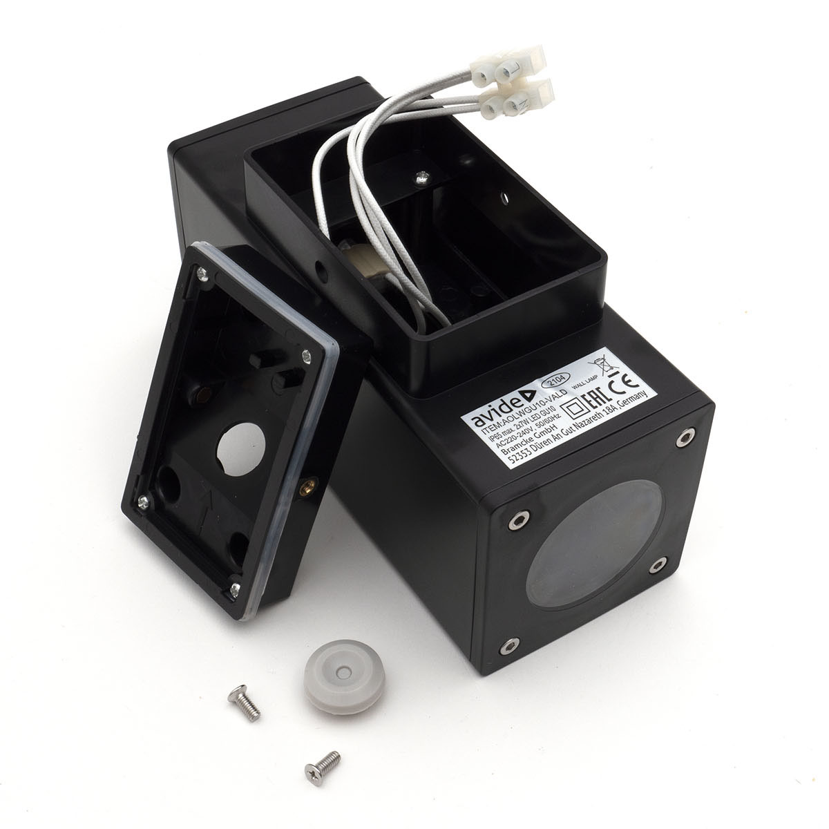 Súčasťou balenia sú skrutky s hmoždinkami na montáž na stenu. Vonkajší lampáš nemá vypínač, je potrebné ho pripojiť na vypínač, stmievač, čidlo a pod.