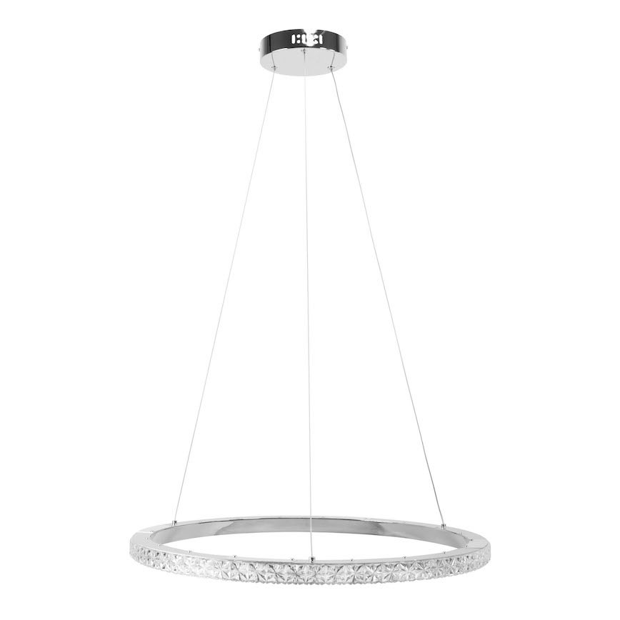 Moderná závesná LED lampa s elegantným, okrúhlym tvarom je ideálnym výberom pre ľudí, ktorí oceňujú štýlové a funkčné osvetlenie. Jej jedinečný dizajn spája jemnú formu krúžku s dekoratívnym povrchom na povrchu tienidla, pripomínajúcim kryštáliky. Konštrukcia v chrómovom odtieni dodáva interiéru teplo a triedu. Lampa je vybavená energeticky úsporným LED zdrojom svetla, ktorý vyžaruje príjemné a rovnomerné svetlo a je ideálny ako v obývacej izbe, nad jedálenským stolom, tak aj v modernej kancelárii. Vďaka možnosti nastavenia výšky zavesenia je možné ju prispôsobiť rôznym výškam miestností.