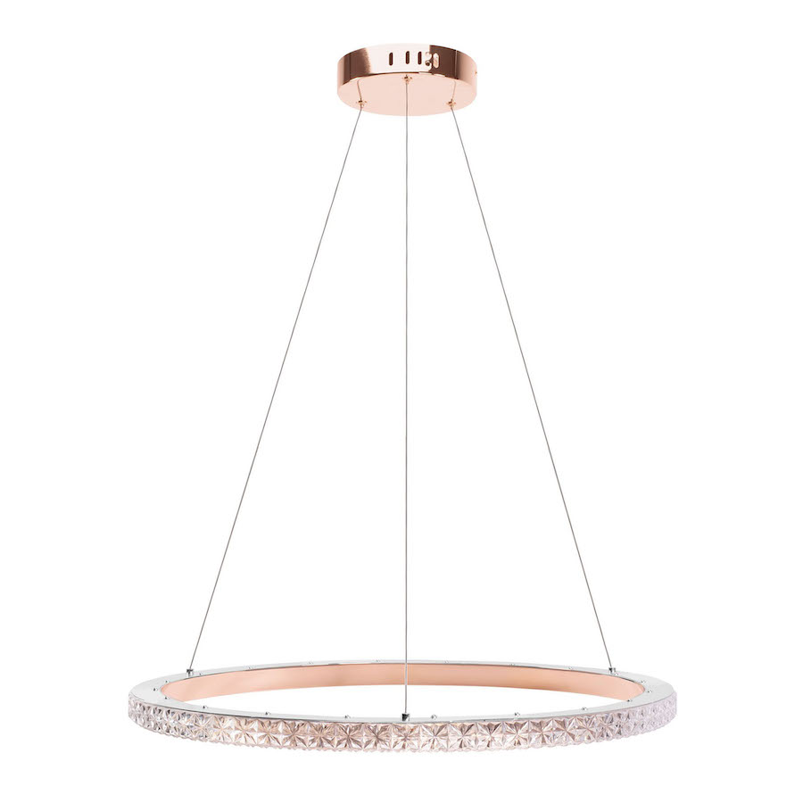 Moderná závesná LED lampa s elegantným, okrúhlym tvarom je ideálnym výberom pre ľudí, ktorí oceňujú štýlové a funkčné osvetlenie. Jej jedinečný dizajn spája jemnú formu krúžku s dekoratívnym povrchom na povrchu tienidla, pripomínajúcim kryštáliky. Konštrukcia v odtieni ružového zlata dodáva interiéru teplo a triedu. Lampa je vybavená energeticky úsporným LED zdrojom svetla, ktorý vyžaruje príjemné a rovnomerné svetlo a je ideálny ako v obývacej izbe, nad jedálenským stolom, tak aj v modernej kancelárii. Vďaka možnosti nastavenia výšky zavesenia je možné ju prispôsobiť rôznym výškam miestností.