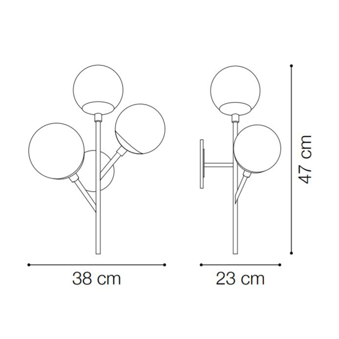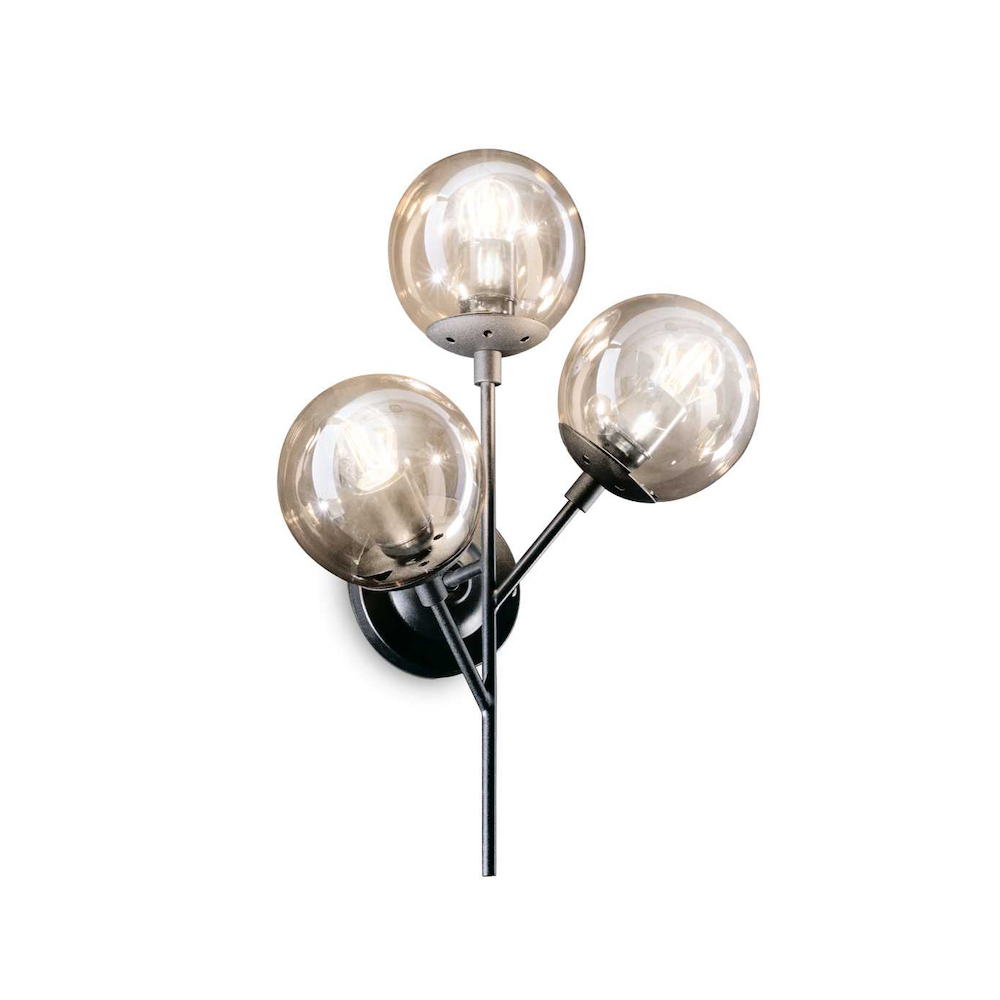 Netradičná nástenná lampa KEPLER z kolekcie interiérového osvetlenia Ideal Lux v zaujímavom retro dizajne vhodne nasvietí obývacie priestory ideálne v modernom alebo klasickom interiéri. Rám svetla je kovový s matnou čiernou povrchovou úpravou. Ako vznášajúce sa bubliny z bublifuku vyzerajú tienidlá z fúkaného skla s jemným nádychom svetlo oranžovej farby. Nástenné svietidlo je osadené päticami E27 s maximálnym príkonom 3 x 40 W. Žiarovky nie sú súčasťou balenia. Odporúčame zvoliť LED žiarovky typu LED, ktoré znižujú náklady na elektrickú energiu a majú extrémne dlhú životnosť. Krytie IP20 je vhodné na použitie do interiéru.