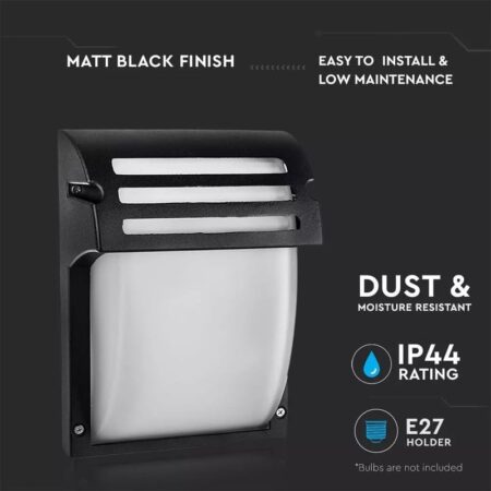 Nástenné vonkajšie svietidlo v modernom dizajne, IP44 pre vonkajšie prostredie. Odolné proti dažďu IP44. Konštrukcia nástenného svietidla z matného čierneho lakovaného skla a hliníka, vnútorne vybavená jednou objímkou E27 na inštaláciu LED svietidiel (Max. 60W) Jednoduchá montáž a použitie vďaka skrutkovému pripojeniu. Súčasťou balenia sú skrutky s hmoždinkami pre montáž na stenu. Výrobok odolný voči dažďu a nepriazni počasia, ktorý možno prednostne inštalovať na chránených miestach a nie v priamom kontakte so silnými lejakmi vody. Odolnosť proti dažďu IP44. Vynikajúce riešenie pre osvetlenie vonkajších prostredí ako sú: záhrady, dvory, chodníky a pod. Vďaka nemu je možné dosiahnuť úsporu energie až 80% v porovnaní s ekvivalentnou halogénovou žiarovkou a s menšou údržbou.
