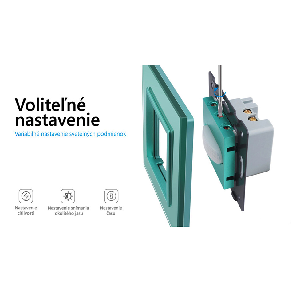 PIR pohybové čidlo, Vypínač svetla je pohybový senzor s elegantným skleneným panelom do domácnosti. Pohybový senzor zapne osvetlenie na základe zaznamenaného pohybu v priestore senzoru. Osvetlenie sa vypne automaticky od posledného zaznamenaného pohybu. Vďaka svojim malým rozmerom je senzor po zabudovaní takmer neviditeľný. Použitie spínača v domácnosti, v pracovných priestoroch alebo všade tam, kde je potrebné zapnúť svetlo na základe pohybu má neobmedzené možnosti. Ďalšie možnosti použitia sú: umiestnenie na schodisko, pred garáž, pred vstupom do budovy, do chodby a pod.