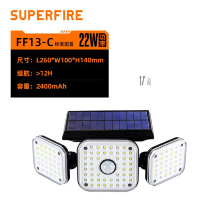 Solárna lampa Superfire FF13-C sa skvele hodí nielen na záhradu, ale aj pri vchode, v garáži alebo na balkóne. Poskytuje osvetlenie pri 300 lm a ponúka 3 režimy svietenia. Vďaka jeho otočným hlavám si ľahko nastavíte jeho polohu tak, aby vyhovovala vašim potrebám. Disponuje tiež citlivým pohybovým senzorom a vyznačuje sa vodeodolnosťou IP54. Jeho pracovná doba dosahuje až 12 hodín a o pohodlné nabíjanie sa stará vstavaný solárny panel.