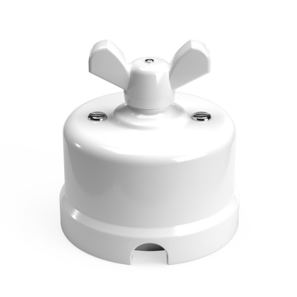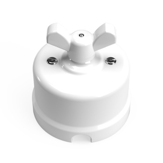 Vypínač/prepínač pre povrchovú montáž z bieleho porcelánu s bielym krídlovým gombíkom
