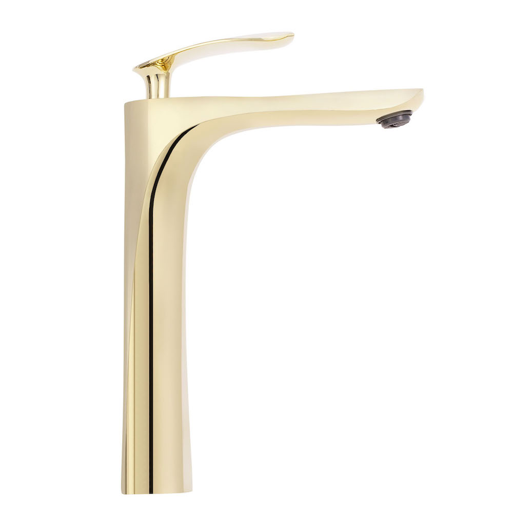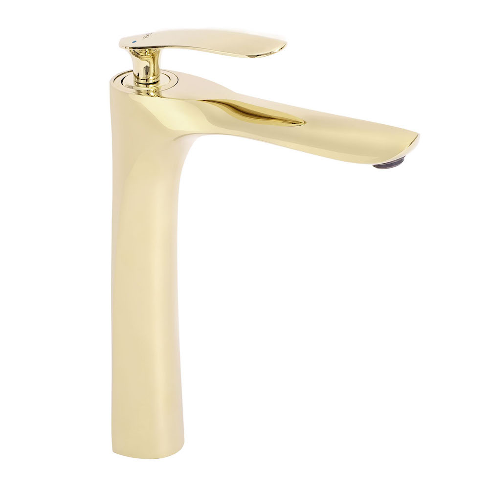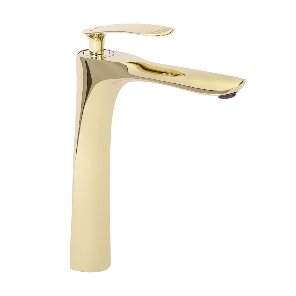 Vysoká dizajnová umývadlová batéria v zlatej úprave