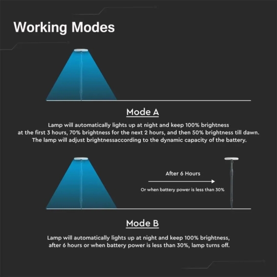 Režim A (predvolený pracovný režim): Lampa sa v noci automaticky rozsvieti a počas prvých 3 hodín si udržiava 100 % jas, ďalšie 2 hodiny 70 % jas a potom 50 % jas až do úsvitu. Svietidlo prispôsobuje jas podľa dynamickej kapacity batérie.
