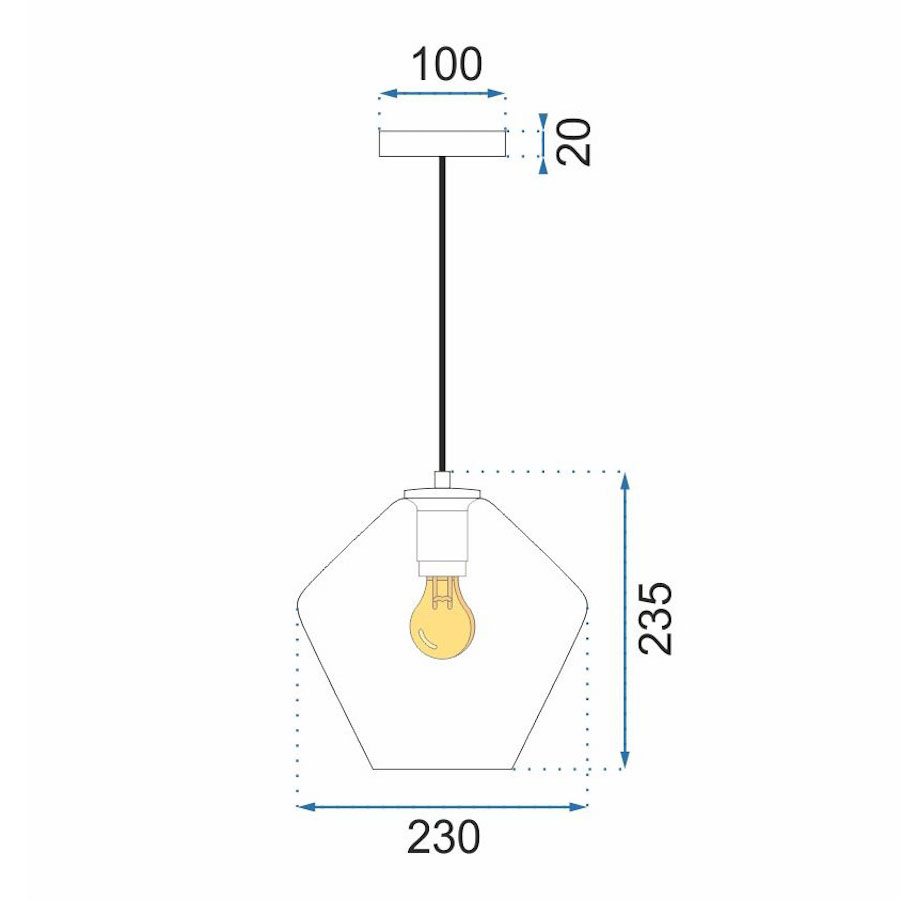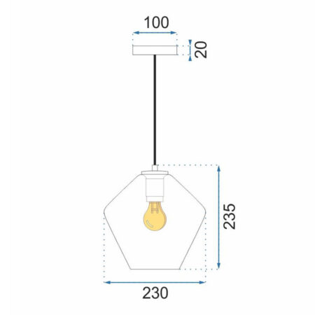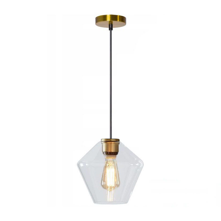 Závesné kreatívne svietidlo so skleneným transparentným tienidlom vyrobené prevažne zo skla s kovovou maskou vo farbe zlatej. Svietidlo má tradičný závit E27, ktorý sa používa vo väčšine svietidiel. Dĺžku kábla je možné prispôsobiť miestnosti alebo usporiadaniu – to všetko záleží na vašej fantázii.