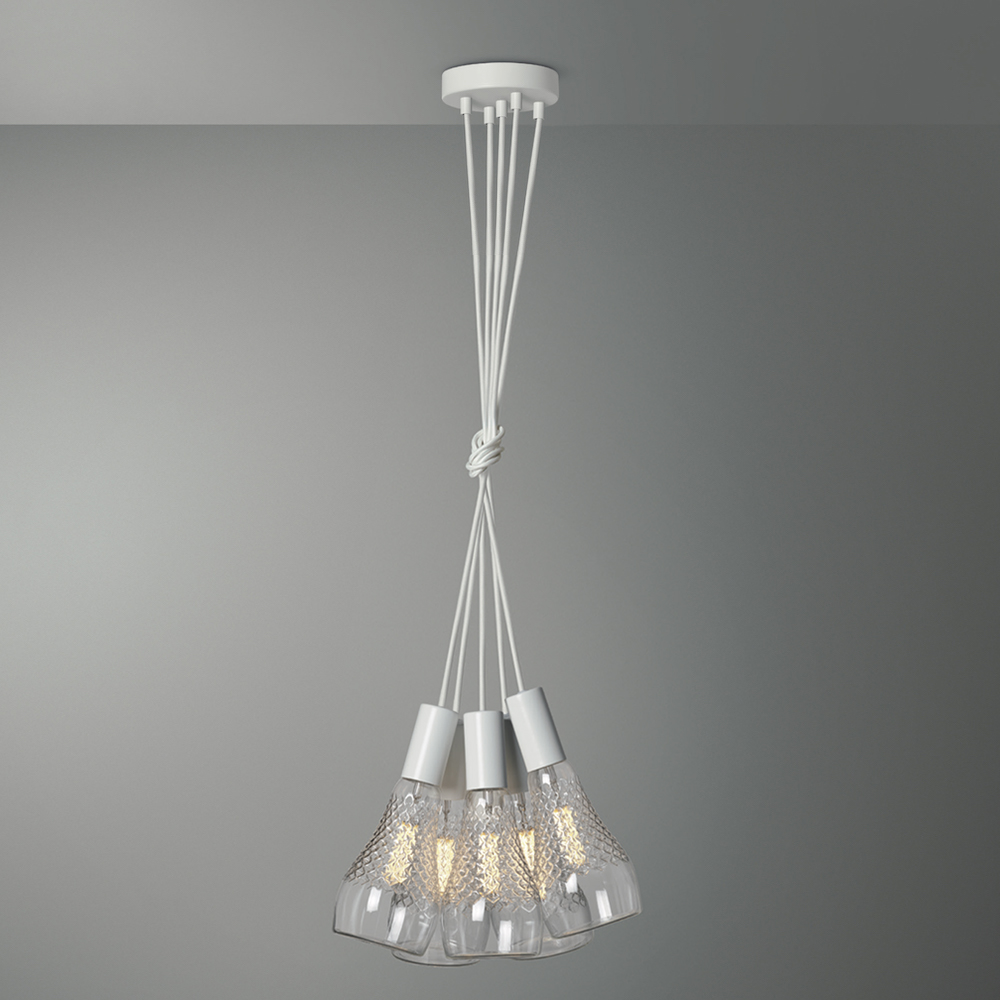 Závesné svietidlo VENEZIA s piatimi päticami v bielej farbe s kryštálovými žiarovkami EOS