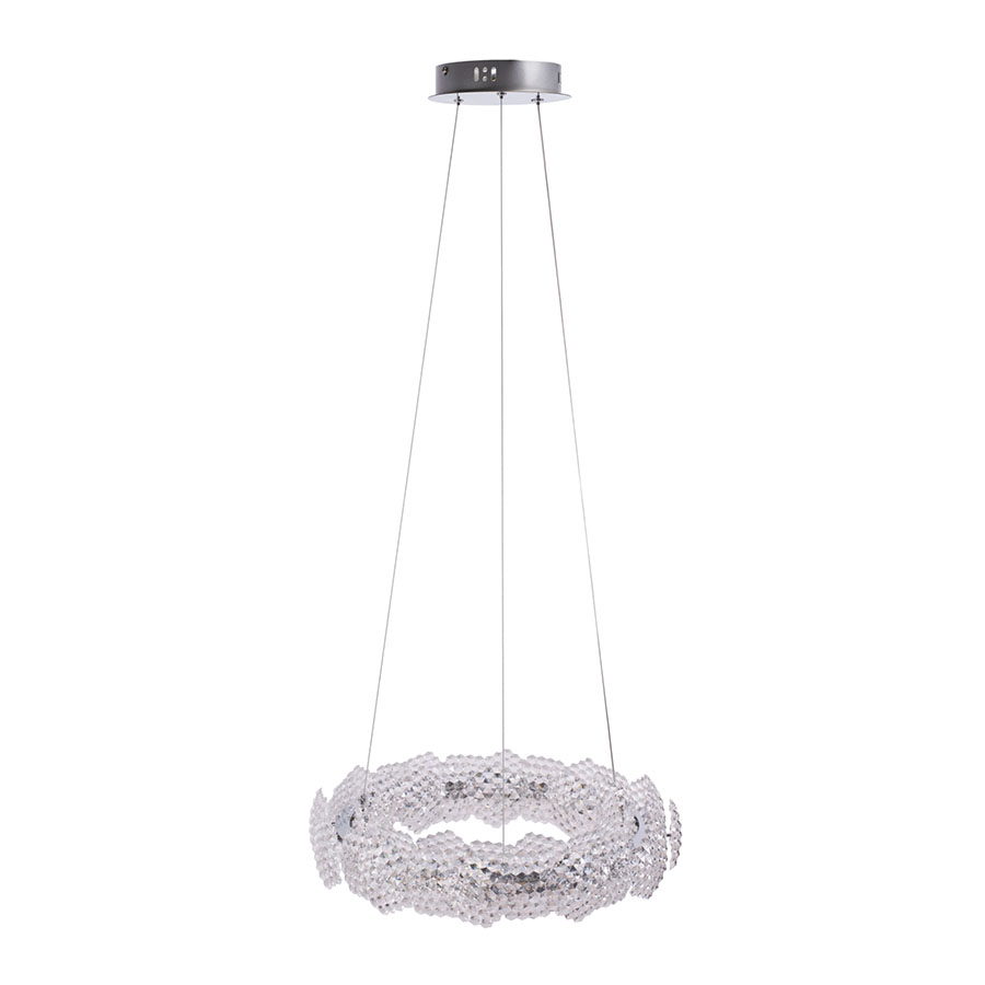 Závesný LED luster GLAMOUR, 57cm.Tento efektný LED luster je návrhom pre ľudí, ktorí hľadajú elegantné a moderné stropné osvetlenie, ktoré zároveň plní dekoratívnu funkciu. Použitie mnohých, transparentných prvkov so štruktúrou pripomínajúcou kolík s kryštálikom spôsobuje, že svetlo sa rozptyľuje jedinečným spôsobom, vytvára jemné odlesky a dodáva interiéru lesk. Zaujímavý prsteň lampy a povrchová úprava v chrómovanom lesku jej dodávajú moderný a exkluzívny charakter. Integrované LED svetelné zdroje zaručujú nielen dokonalé osvetlenie miestnosti, ale aj energetickú úspornosť a dlhú životnosť. Ideálne sa hodí do obývacej izby, spálne, haly alebo komerčných priestorov.
